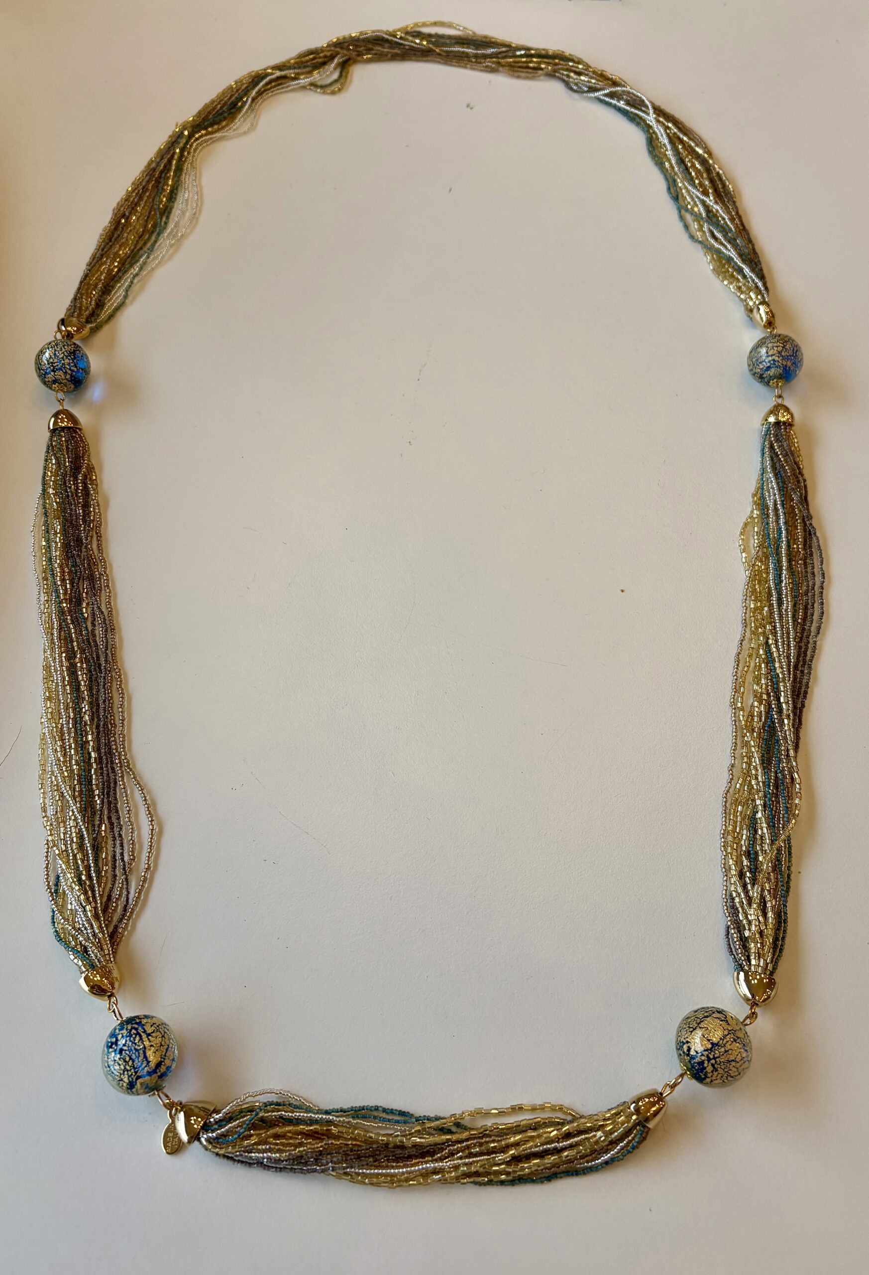 Collana da indossare sia lunga che doppio giro realizzata interamente con la conteria di vetro ed impreziosita con perle in vetro di Murano.