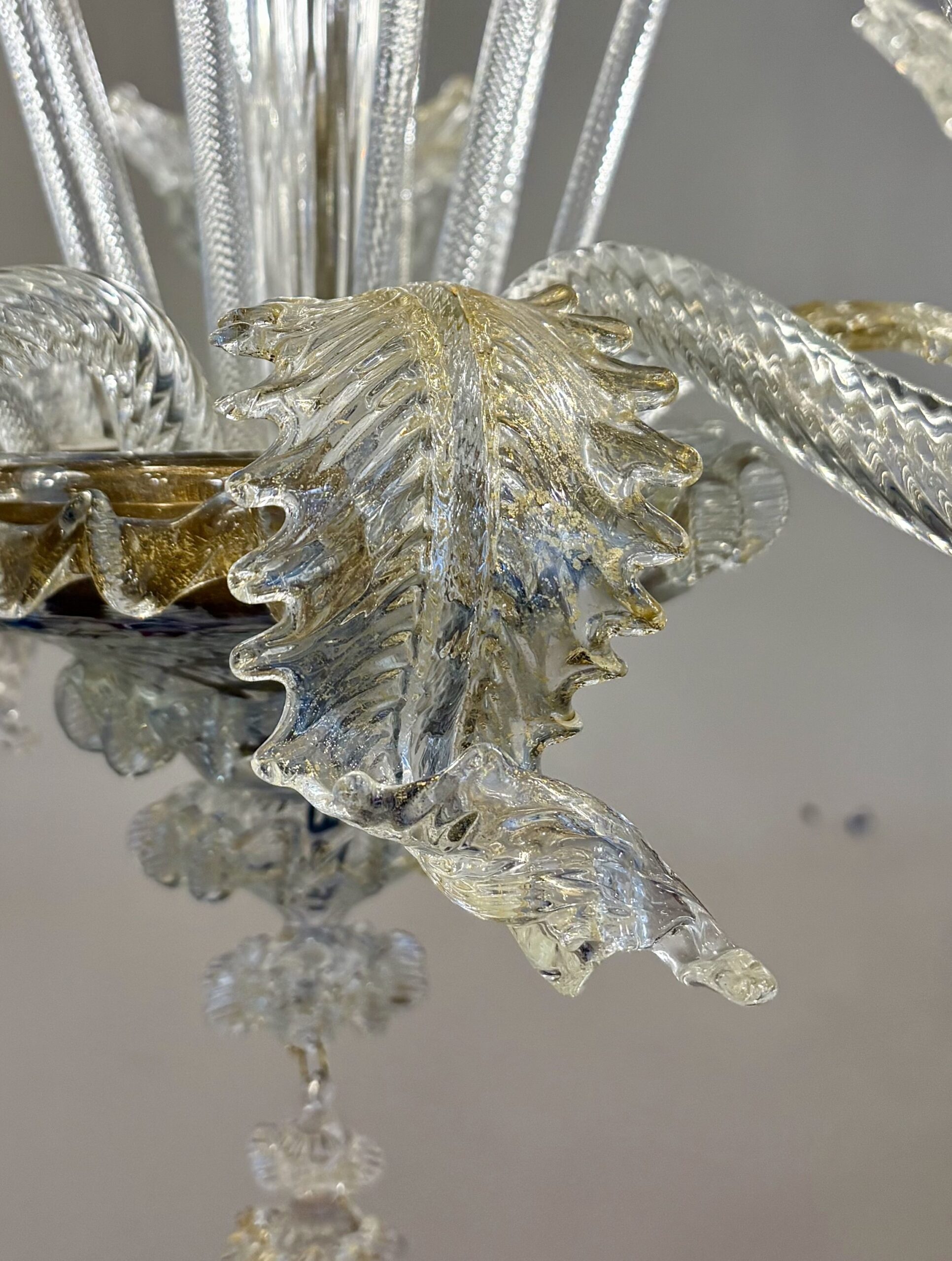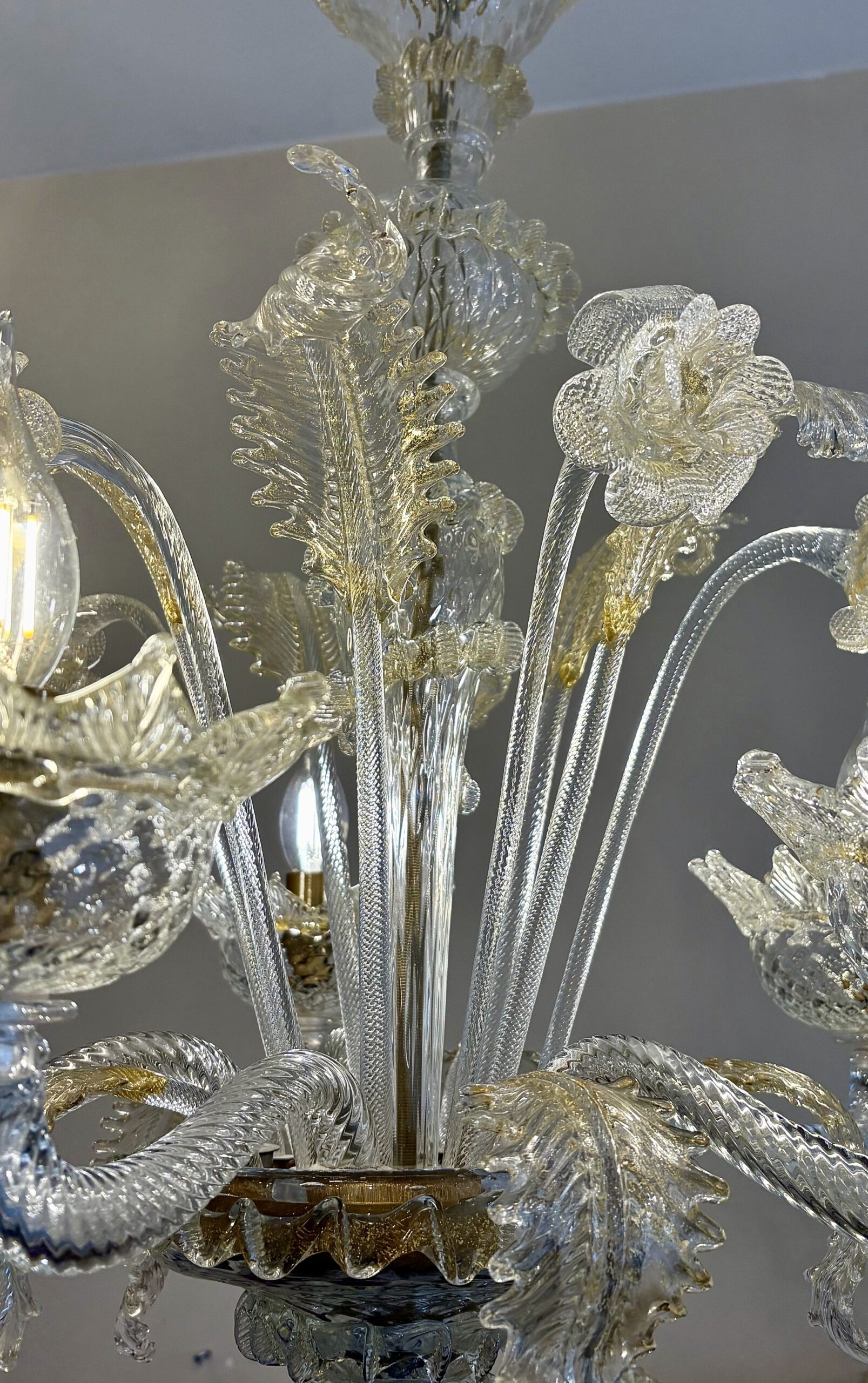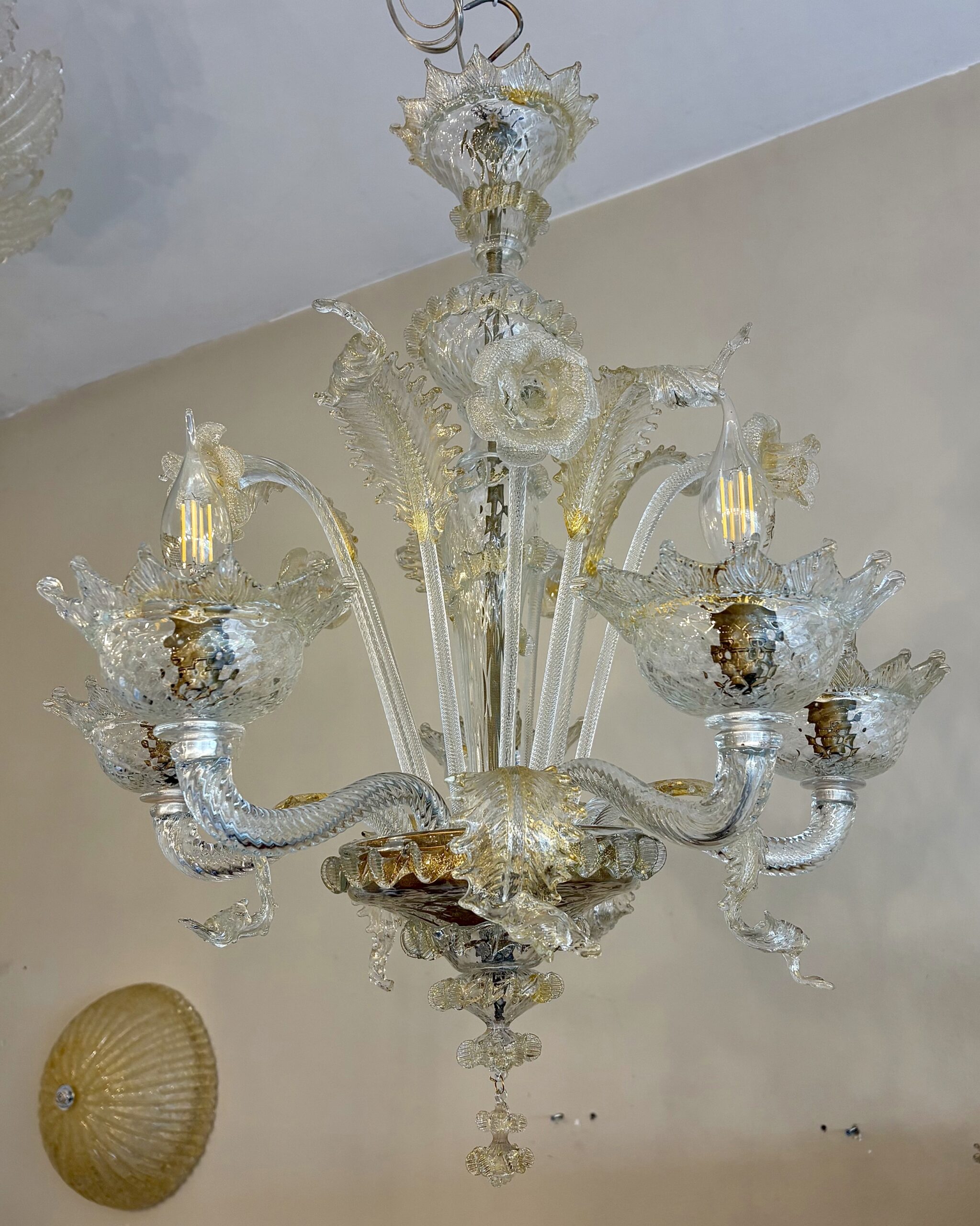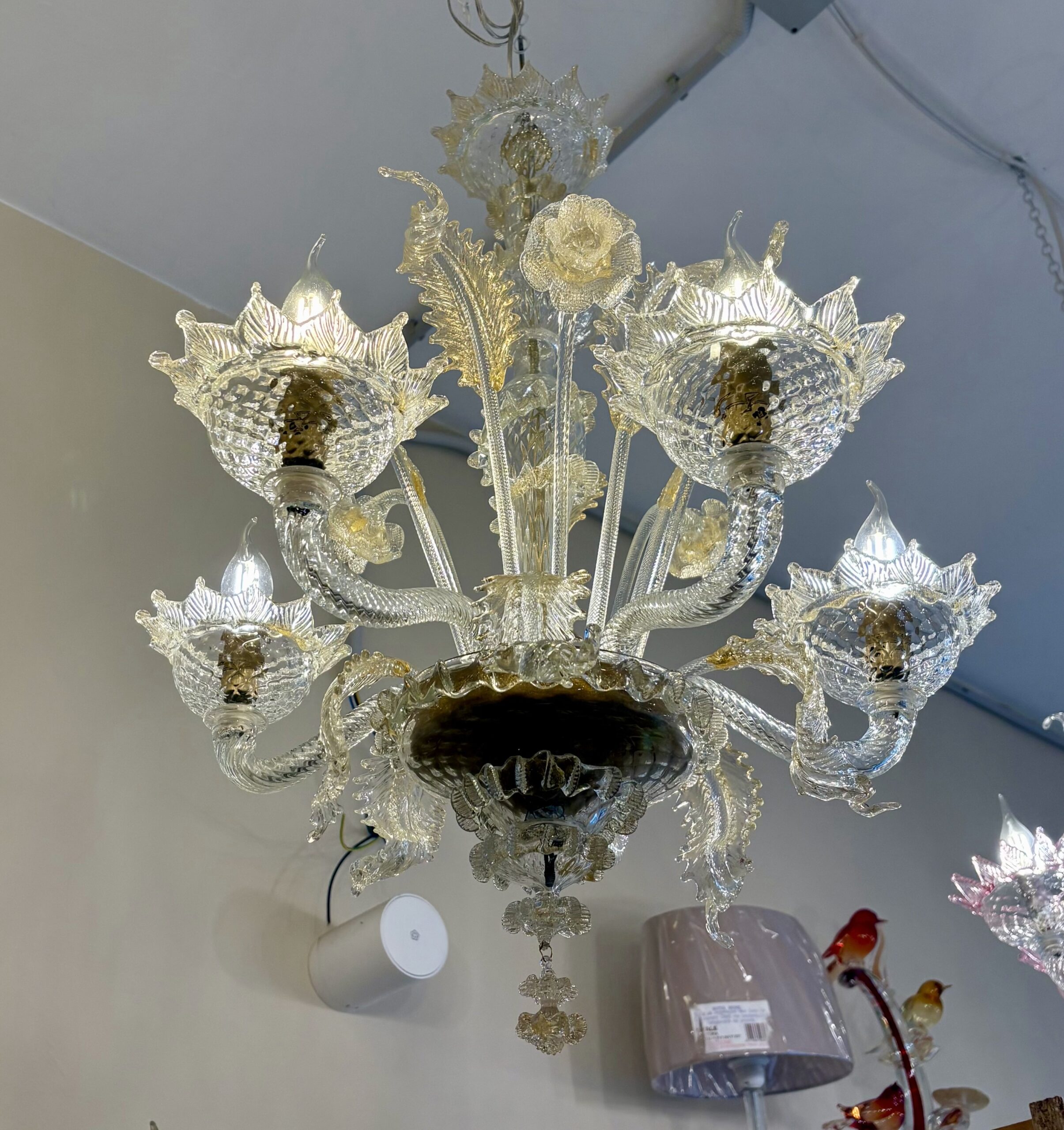 Elegante lampadario in vetro di Murano a 5 luci di colore cristallo oro.