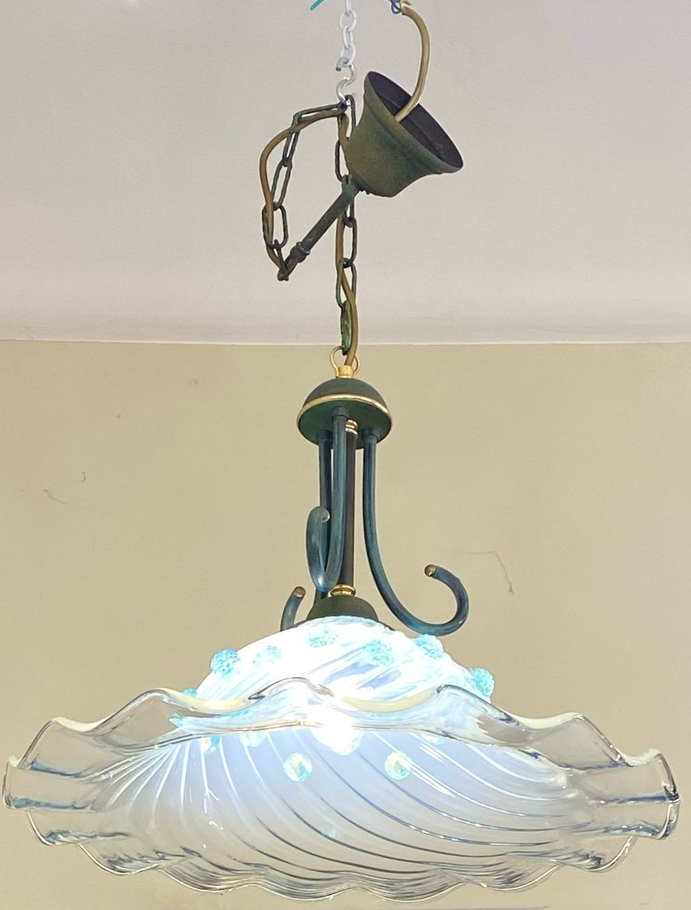 Suspension Murano glass chandelier with a plate that recalls typical Venetian handkerchiefs.
