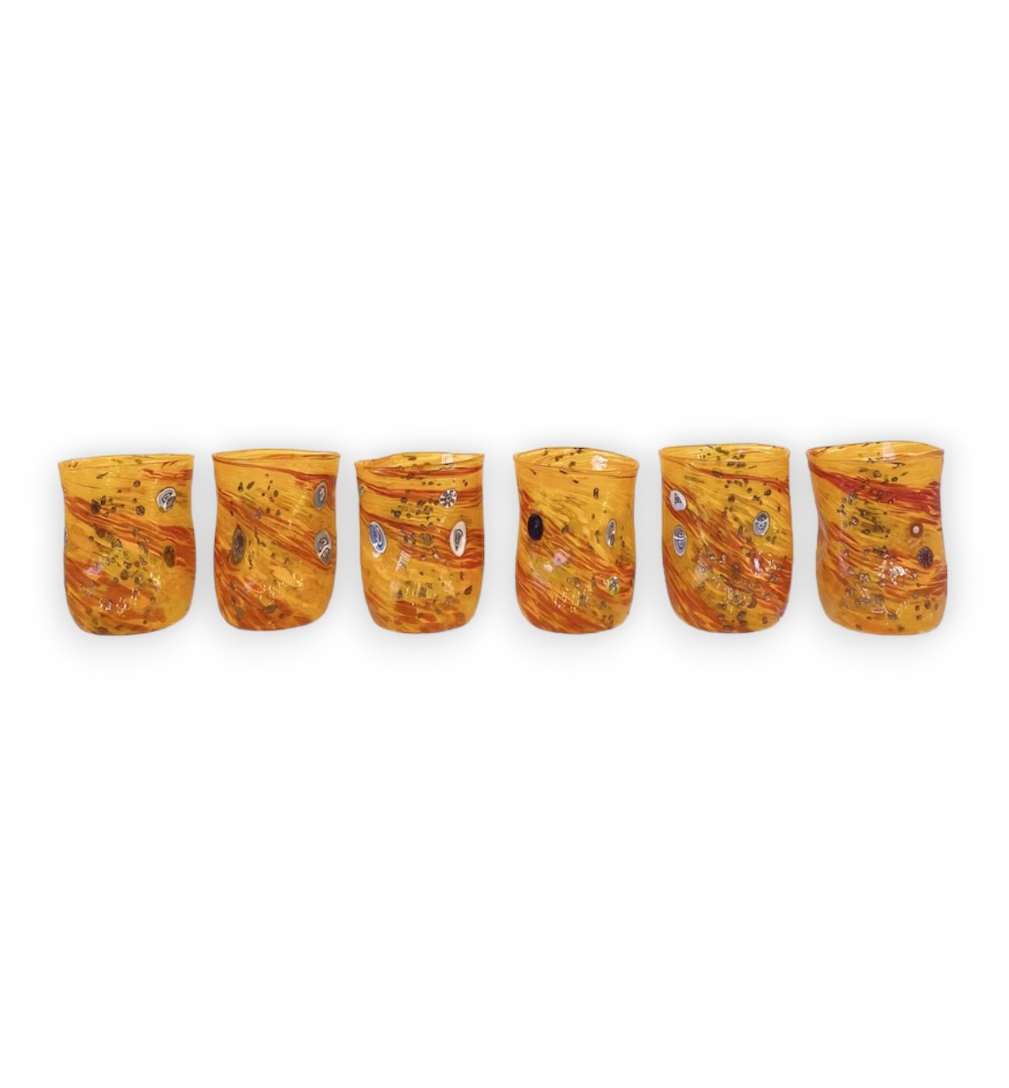 Elegante e originale set di sei bicchieri di colore arancione e rosso in vetro di Murano.